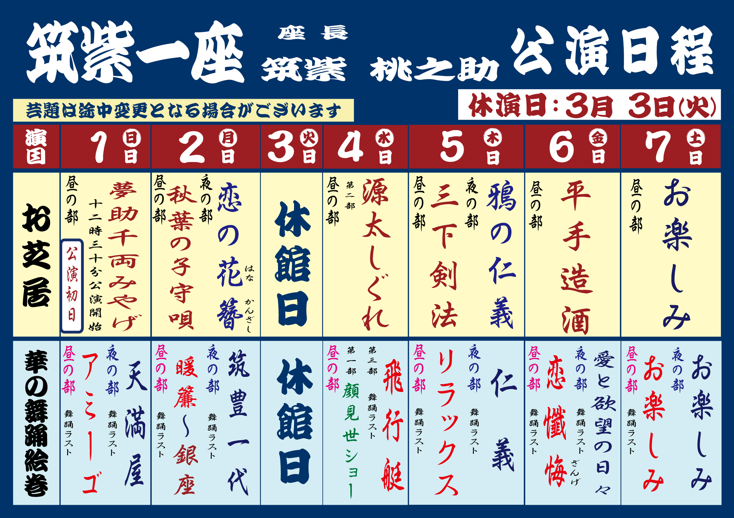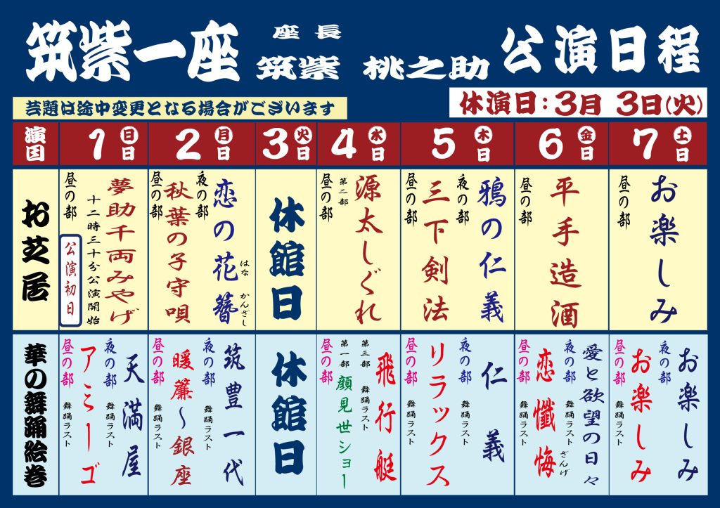 大衆演劇「筑紫桃太郎一座」3月1日(日)~7日(土)の演目です。