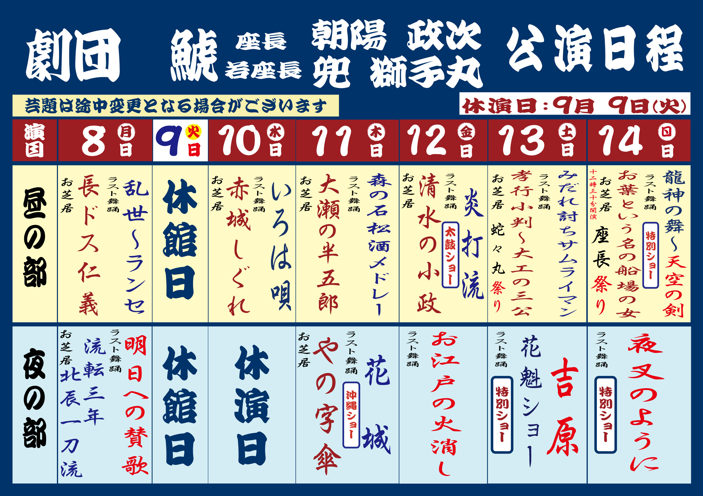 大衆演劇「劇団鯱」9月8日(月)~14日(日)演目