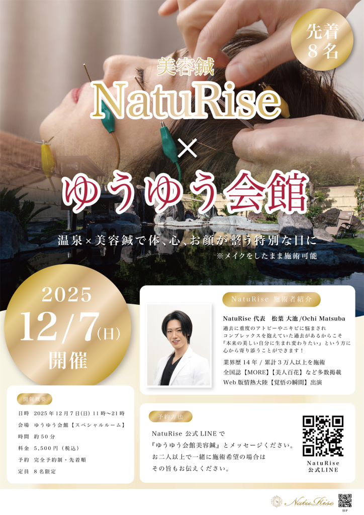 ※予約はNatuRise公式LINEで、「ゆうゆう会館美容鍼」とメッセージしてください。