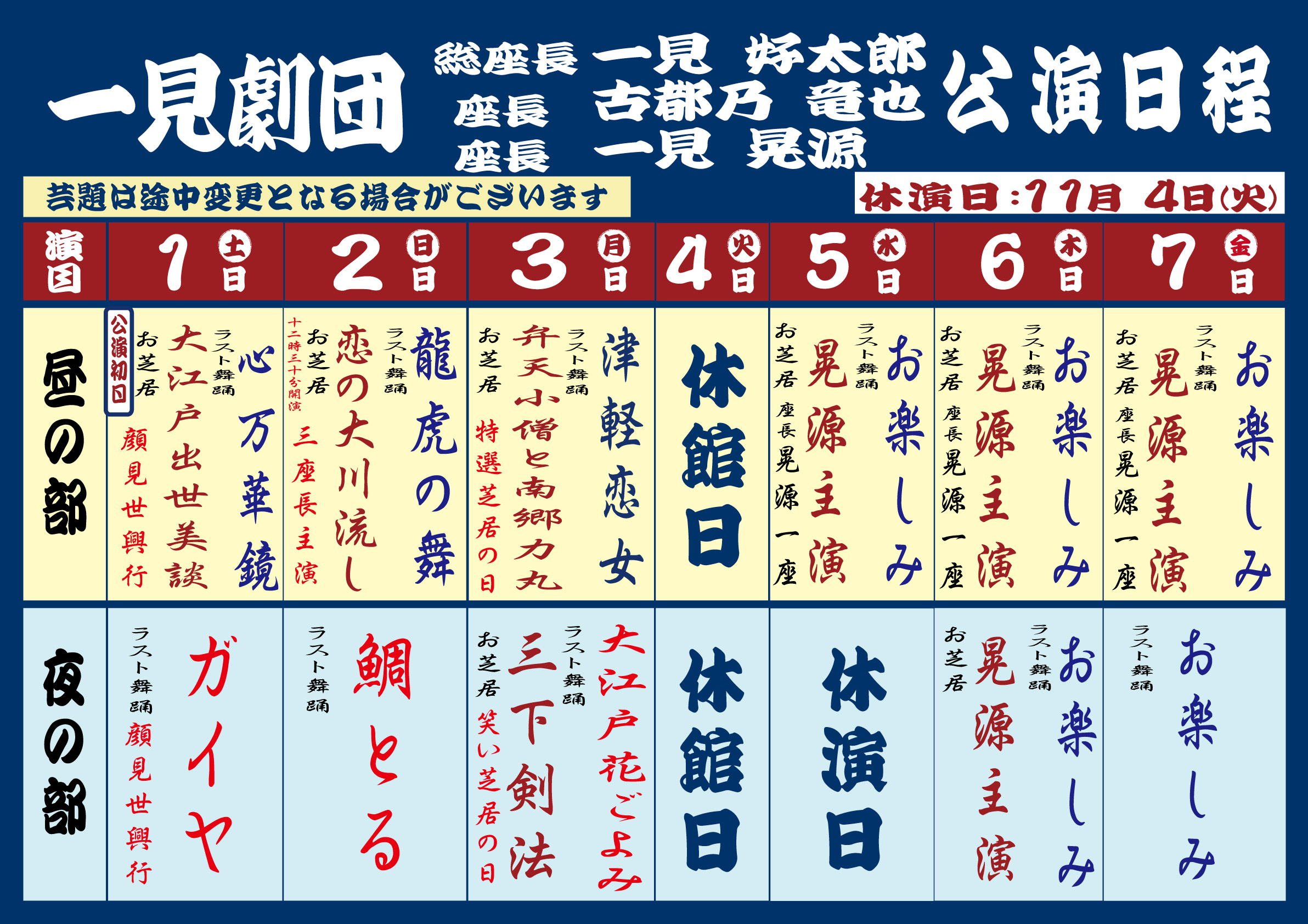 大衆演劇「三國座 一見劇団」11月1日(土)~7日(金)演目