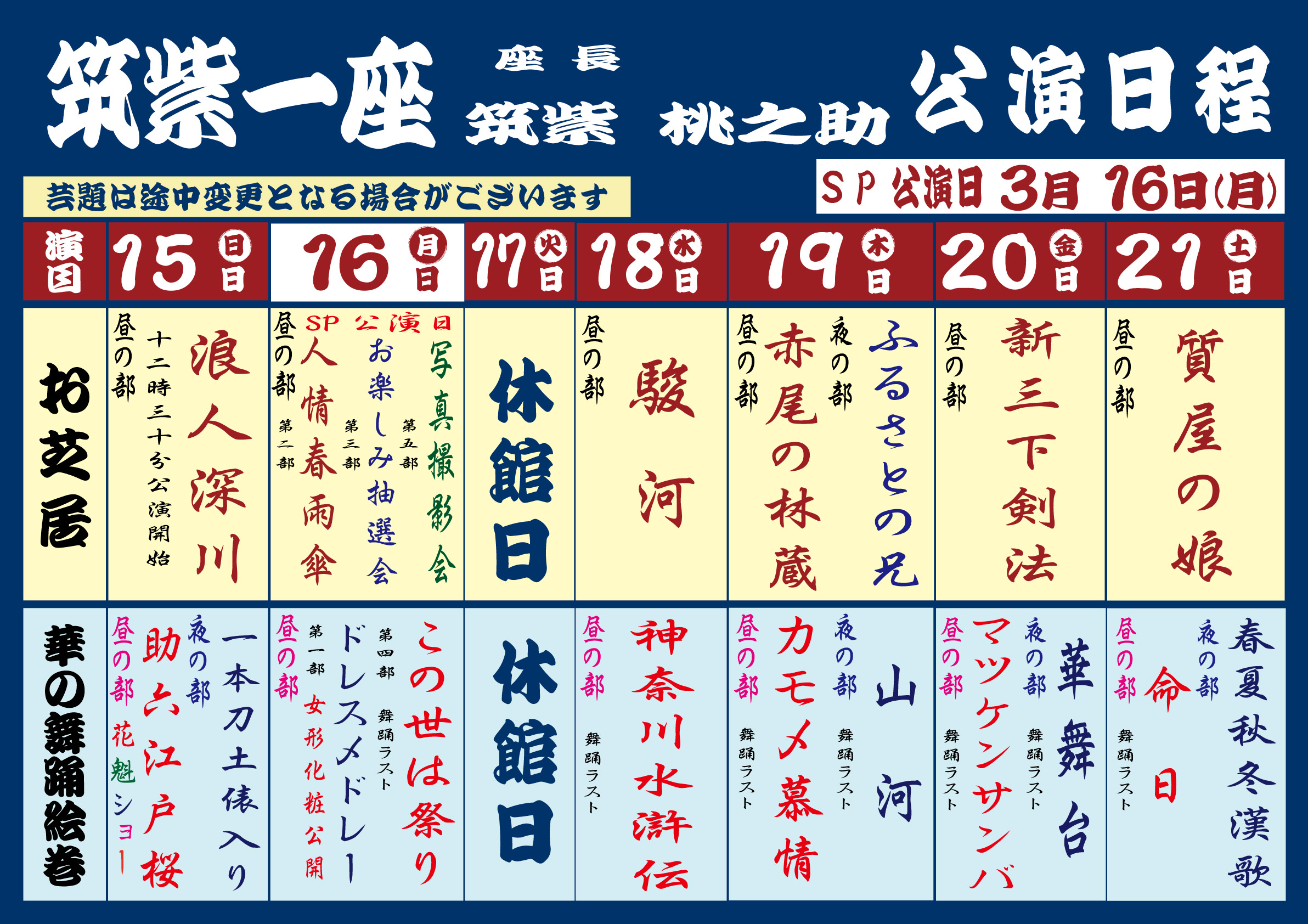 大衆演劇「筑紫桃太郎一座」3月15日(日)~21日(土)の演目です。